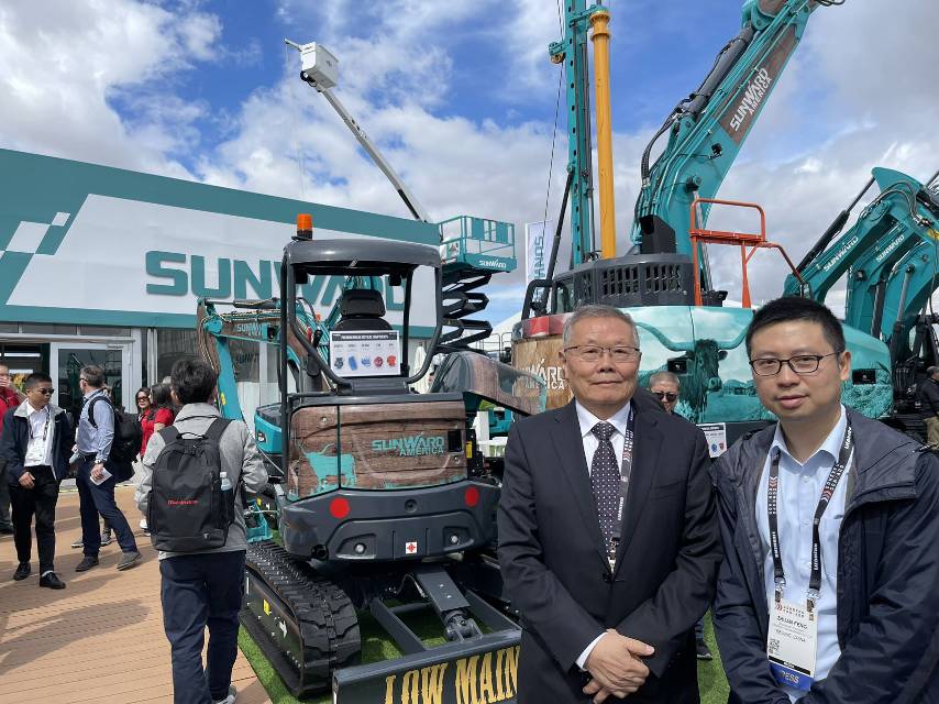 Feng Zhuan, a reporter from the front of the Road Machinery Network, took a group photo with He Qinghua, the honorary chairman of Sunward Intelligence!