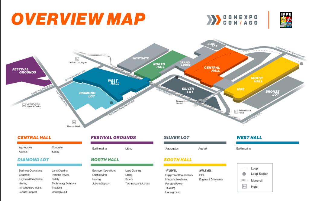 The main exhibitors are: Caterpillar, Hyundai Construction Machinery (including Devanlon), John Deere Construction and Forestry Equipment, Volvo Construction Equipment, Kobelco Construction Machinery, Komatsu, Hitachi Construction Machinery America, Liebherr, K-TEC/Ashland, Linkbet Crane, McCloskey International, Sandvik Mining and Rock Technology, Sany Heavy Industry, Xugong, Zoomlion, Liugong, Sunward Intelligence, Lingong Heavy Machinery, Zhejiang Dingli, Super Industry International, Terex, Wittgen Group, Astec Industry, Case Construction Machinery.